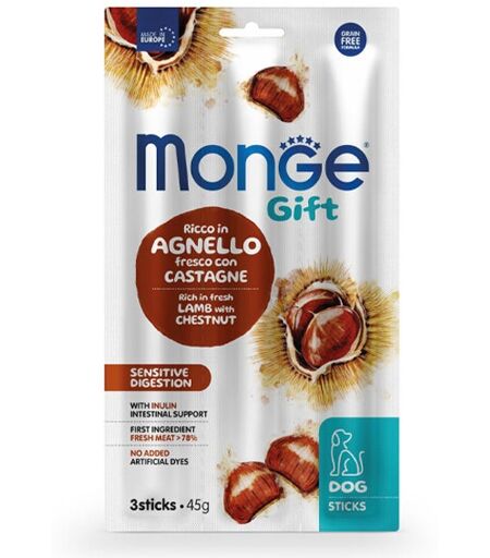 Benessere Del Tuo Cane MONGE GIFT SENSITIVE DIGESTION DOG RICCO IN AGNELLO FRESCO CON CASTAGNE E INULINA è un alimento complementare per cani adulti. Specificatamente sviluppato per il benessere del tuo cane grazie all’inclusione di inulina per supportare il benessere intestinale. Prodotto formulato senza cereali e con carne fresca preziosa fonte di proteine ad elevata digeribilità e valore biologico. La formulazione è arricchita con vitamine per la vitalità quotidiana. L’inclusione di ingredienti funzionali, come le castagne con proprietà astringenti, è frutto della ricerca Made in Italy per supportare la qualità di vita dei nostri cani. Senza coloranti artificiali e zuccheri aggiunti. Grain Free Senza coloranti e conservanti CONTENUTO Ogni confezione contiene 3 stick da 15Gr. COMPOSIZIONE Pesce fresco (68,5%), agnello fresco (14%), proteina di pesce idrolizzata (salmone), cellulosa in polvere, pesce disidratato (salmone e trota), prodotti del lievito, sostanze minerali, inulina ...