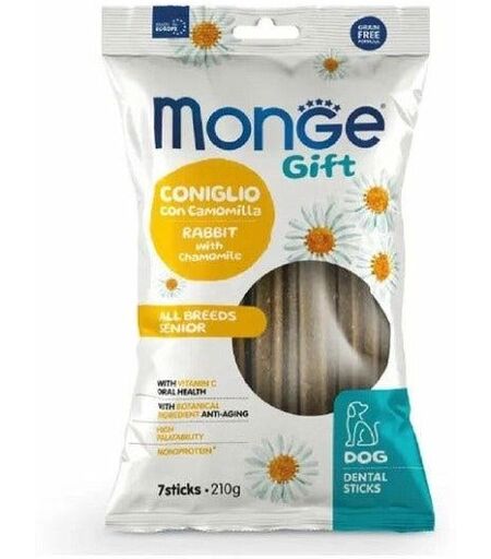 Benessere Del Tuo Cane MONGE GIFT ALL BREEDS SENIOR DOG CONIGLIO CON CAMOMILLA è un alimento complementare per cani anziani di tutte le taglie. Specificatamente sviluppato per il benessere del tuo cane grazie all’inclusione di fibra vegetale per una maggiore elasticità di texture e favorire la masticazione. Prodotto formulato senza cereali e con un’unica fonte proteica animale*, il conIgIio, preziosa fonte di proteine ad elevata digeribilità e valore biologico. La formulazione è arricchita con vitamina C per la salute del cavo orale ed è caratterizzata da elevata appetibilità per stimolare i palati più difficili. L’inclusione di ingredienti botanici, come la camomilla con proprietà antiossidanti, è frutto della ricerca Made in Italy per supportare la qualità di vita dei nostri cani. Senza coloranti artificiali e zuccheri aggiunti. *Può contenere tracce di altre fonti proteiche. Grain Free Senza coloranti e conservanti Composizione Coniglio disidratato (30%), patate, glicerina, ...