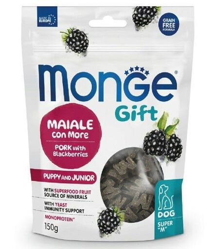 Benessere Del Tuo Cucciolo MONGE GIFT PUPPY AND JUNIOR DOG MAIALE CON MORE è un alimento complementare per cani cuccioli in accrescimento. Specificatamente sviluppato per il benessere del tuo cucciolo grazie all’inclusione di L-carnitina per lo sviluppo della massa muscolare. Prodotto formulato senza cereali e con un’unica fonte proteica animale*, il maiale, preziosa fonte di proteine ad elevata digeribilità e valore biologico. La formulazione è arricchita con vitamine per la vitalità quotidiana e con lievito a rinforzo del sistema immunitario. L’inclusione di frutta superfood, come le more fonte di minerali utili all’accrescimento, è frutto della ricerca Made in Italy per supportare la qualità di vita dei nostri cani. Senza coloranti artificiali e zuccheri aggiunti. *Può contenere tracce di altre fonti proteiche. Grain Free Senza coloranti e conservanti Composizione Maiale disidratato (35%), patate, glicerina, amido di patate, more disidratate (1% equivalente a 8,3% di more ...