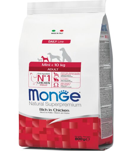 Monge Mini ADULT POLLO Descrizione Alimento completo e bilanciato per cani adulti di taglia mini ( Senza coloranti e conservanti artificiali aggiunti. No cruelty test. Ingredienti Pollo (disidratato 30%, carne fresca 10%), riso, granturco, grasso animale (olio di pollo purificato al 99,5%), polpa di barbabietola essiccata, lievito di birra, glutine di granturco, proteine animali idrolizzate (fegato), pesce (salmone essiccato), olio di pesce (olio di salmone 1%), sostanze minerali, prodotti del lievito (mannano oligo saccaridi MOS 1%), xilo-oligosaccaride (XOS 0,3%), Yucca schidigera (0,3%), farina di alghe (spirulina - Arthrospira platensis 0,3%), glucosamina, solfato di condroitina. Caratteristiche nutrizionali Componenti analitici: Proteina grezza 26%, Fibra grezza 2,2%, Grassi grezzi 14%, Ceneri grezze 6%, Calcio 1,2%, Fosforo 0,8%, Acidi grassi omega-3 0,7%, Acidi grassi omega-6 3,8%, Energia metabolizzabile 4.050 kcal/kg. Additivi nutrizionali: Vitamina A (acetato di retinile) 33.800 UI/kg, Vitamina D3 1.700 UI/kg, Vitamina E (tutto-rac- alfa-tocoferile acetato) 80 mg/kg, Selenio (Selenito di sodio 0,4 mg/kg) 0,2 mg/kg, Manganese (solfato manganoso monoidrato 99 mg/kg) 32 mg/kg, Zinco (ossido di zinco 187 mg/kg) 150 mg/kg, Rame [solfato di rame (II) pentaidrato 50 mg/kg] 12 mg/kg, Ferro [solfato di ferro (II) monoidrato 326 mg/kg] 107 mg/kg, Iodio (iodato di calcio anidro 2,6 mg/kg) 1,7 mg/kg; L-carnitina 100 mg/kg; DL-metionina tecnicamente pura 1.500 mg/kg. Additivi tecnologici: Estratti di tocoferolo da oli vegetali. Additivi organolettici: estratto di Castagna (Castanea sativa) 20 mg/kg. Modalità d'uso La razione giornaliera raccomandata indicata in tabella può essere suddivisa in 2 pasti giornalieri. Le quantità possono essere adattate a seconda della taglia, età e delle condizioni di vita dell’animale. Lasciare sempre a disposizione acqua fresca e pulita. Quando il prodotto va a sostituire un altro tipo di mangime e/o tipo di alimentazione si consiglia di introdurlo gradualmente, in almeno 1 settimana di tempo. Può contenere tracce di altre fonti proteiche. Razione giornaliera Peso del cane Cane in appartamento Cane in giardino Cani sportivi climi freddi 2 kg 50 g 55 g 65 g 3 kg 66 g 73 g 87 g 5 kg 95 g 105 g 126 g 8 kg 135 g 150 g 180 g 10 kg 155 g 175 g 210 g 12 kg 173 g 212 g 257 g Avvertenze Alimento per animali, non utilizzabile per alimentazione umana. Conservazione Conservare a temperatura ambiente. Validità a confezione integra: 18 mesi. Formato Disponibili sacchi da 800 g, 3.000 g e da 7.500 g. Cod. 800947000409A (800 g) 800947000411B (3.000 g) 800947000405 (12.000 g) ...