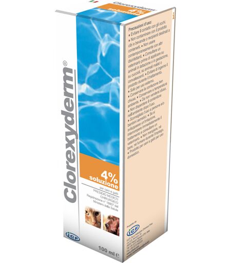 Clorexyderm - SOLUZIONE 4% - Descrizione - Coadiuvante della shampoo - terapia in corso di piodermiti profonde, dermatite delle pliche cutanee e dermatofitosi; - Disinfettante della cute con azione umettante ed emolliente; - Disinfettante per l'asepsi chirurgica del paziente e del chirurgo; - Deter… ...