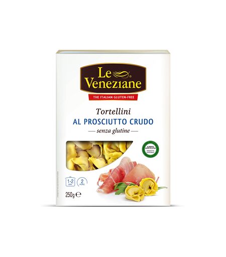 Le Veneziane - Tortellini Al PROSCIUTTO CRUDO - Descrizione Tortellini al prosciutto crudo senza glutine. Prodotto specificatamente formulato per persone intolleranti al glutine. Ingredienti Farina di riso, brasato di manzo [carne di manzo, riso, cipolla, carote, sedano, proteina vegetale, vino (co… ...