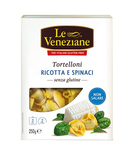 Le Veneziane Tortelloni ricotta e spinaci - Descrizione Tortelloni con ripieno alla ricotta e spinaci senza glutine. Prodotto specificamente formulato per persone intolleranti al glutine. Ingredienti Farina di riso, amido di mais, uova, formaggio grattugiato (latte, sale, caglio, lisozima di uova),… ...