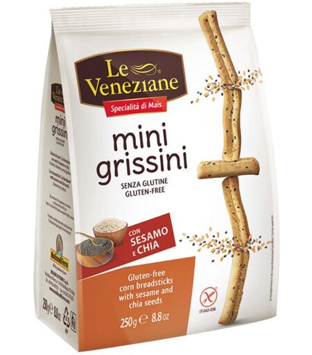 Le Veneziane - Specialità di Mais - mini grissini - Minigrissini con sesamo e chia, senza glutine. Formato Confezione da 250 g. ...