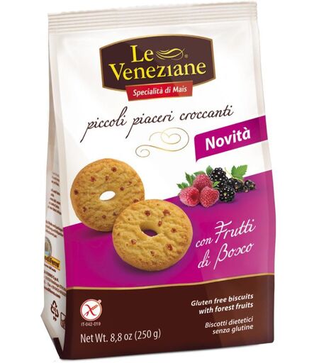 Le Veneziane Piccoli piaceri croccanti con Frutti di Bosco - Biscotti dietetici senza glutine. Ingredienti Farina di mais (32,9%); zucchero; farina di riso; sciroppo di glucosio; burro; olio vegetale non idrogenato; frutti di bosco (4,3%) (mela, purea di mela, succo di ribes, fragola, lamponi, sacc… ...