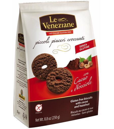 Le Veneziane Piccoli piaceri croccanti con Cacao e Nocciole - Biscotti dietetici senza glutine. Ingredienti Farina di mais (31,6%); zucchero; farina di riso; sciroppo di glucosio; burro; olio vegetale non idrogenato; cacao in polvere (3,1%); nocciole (2,9%); fibra vegetale; fecola di patate; agenti… ...