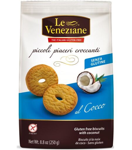 Le Veneziane Piccoli piaceri croccanti al Cocco - Biscotti dietetici senza glutine. Ingredienti Farina di mais (32,7%); zucchero; farina di riso; sciroppo di glucosio; burro; olio vegetale non idrogenato; macinato di cocco (4,8%); fibra vegetale; fecola di patate; agenti lievitanti: bicarbonato di … ...