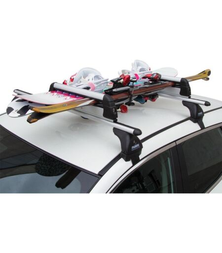 Portasci e snowboard universale per barre portatutto realizzato in alluminio. Larghezza di carico 35 cm Telaio rialzato ideale per sci con piastre particolarmente alte. Dotato di antifurto con chiave e doppio gancio di sicurezza. Capacità di carico f ...