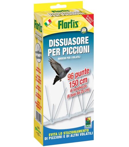 Flortis dissuasore aiuta ad allontanare piccioni e volanti da davanzali di finestre, balconi, terrazzi, cornicioni e tetti, in modo meccanico, impedendone l`atterraggio, senza arrecare loro alcun danno. È costituito da aghi in acciaio inox da montare su una base in policarbonato, trasparente e resistente ai raggi UV, dotata di una speciale guida per il fissaggio. Copre fino a 1,5 m, è applicabile ad ogni superficie, è praticamente non visibile una volta installato, è di facile installazione e manutenzione, resistente alle intemperie e di lunga durata. Un astuccio contiene 6 basi da 25 cm in policarbonato (totale 1,5 m) + 48 spilli in acciaio inox (totale 96 punte). ...