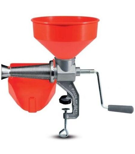 Ghiera e morsa sono realizzati in alluminio pressofuso brillantato per alimenti; Filtro in acciaio inox di lunghezza 15 cm; Imbuto di diametro 19 cm; Imbuto e scivolo realizzati in plastica; Elica in resina acetilica per alimenti. ...