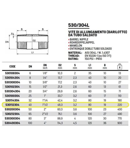Diametro 40x1"1/2 530 BARILOTTO ø1.1/2"MM L.80 INOX 304L ...