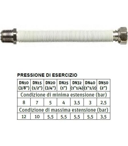 UTILIZZO PRINCIPALE: Cal daie - Boiler - CO NDIZIONATORI E FANCOI L - PANNELLI SOLARI TUBO acciaio inossidabile austenitico AISI 304, spessore >= 0.21 mm MASCHIO acciaio inox AISI 303, filettatura UNI EN 10226-1 Cannotto portagirello acciaio inox AISI 303 con sede di tenuta piana DADO ottone CW619N nichelato con filettatura UNI EN ISO 228-1 Guaina di protezione poliolefina reticolata termoretraibile ignifuga colore bianco, protegge il tubo dalla aggressione di sostanze corrosive esterne e smorza le vibrazioni Trattamento solubilizzato dopo la saldatura dei terminali TEMPERATURA DI ESERCIZIO: La temperatura di esercizio dei giunti è stimata in un range di -55°C +250°C. Per i giunti che presentano la guaina di protezione la temperatura massima è di +120°C. In caso di applicazioni con temperature inferiori o maggiori a quelle indicate preghiamo di consultare sempre il nostro staff tecnico. RAGGIO DI CURVATURA: Raggio minimo di curvatura = 1,5 volte il diametro esterno del tubo (1,5 De) ...