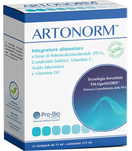 ARTONORM - Descrizione Artonorm è un integratore alimentare a base di palmitoiletanolamide (PEA) condroitin solfato vitamina C acido ialuronico e vitamina D3. La vitamina D3 sostiene la formazione del collagene per la normale funzione delle ossa e delle cartilagini. La vitamina D favorisce il ma… ...