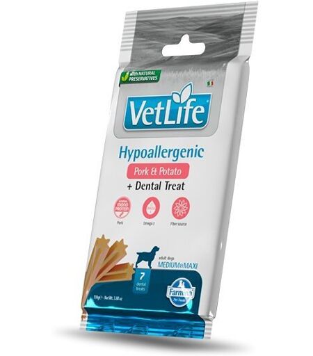 Vet Life Dental Treat Hypoallergenic Pork 100g è lo snack ipoallergenico cane con monoproteina suina che garantisce protezione dentale, gusto e massima sicurezza per cani sensibili. ...