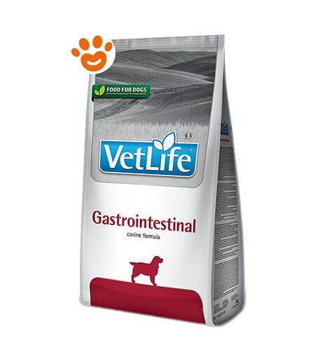 Farmina Vet Life Gastrointestinal è un alimento dietetico completo, per cani, per la riduzione dei disturbi acuti dell'assorbimento intestinale, durante le diarree acute e i periodi di convalescenza successivi; compensazione della cattiva digestione, insufficienza pancreatica esocrina. Composizione: proteine di pollo disidratate, riso, grasso di pollo, uova essiccate, avena, polpa di barbabietola essiccata, semi di lino, olio di pesce, proteina di pesce idrolizzata, fibra di piselli, inulina (0.6%), cloruro di potassio, carbonato di calcio, lievito di birra essiccato, fosfato mono-bicalcico, cloruro di sodio, glucosamina (0.025%), solfato di condroitina (0.025%). Additivi: Additivi nutrizionali: Vitamina A 15000UI; Vitamina D3 900UI; Vitamina E 600mg; Vitamina C 150mg; niacina 38mg; acido pantotenico 15mg; Vitamina B2 7.5mg; Vitamina B6 6mg; Vitamina B1 4.5mg; Vitamina H 0.4mg; acido folico 0.45mg; Vitamina B12 0.06mg; cloruro di colina 1800mg; beta-carotene 1.5mg; chelato di zinco ...