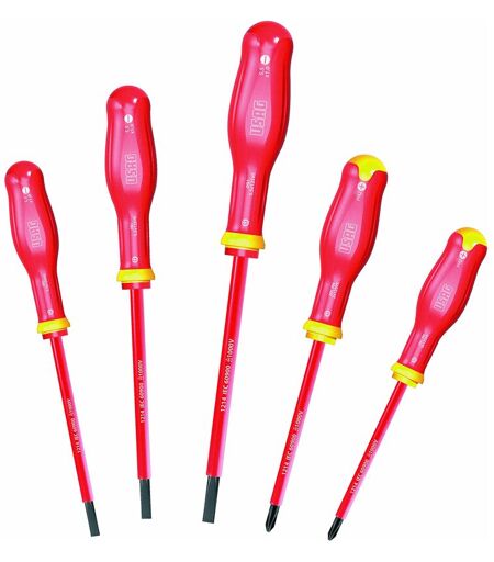 Serie di giraviti con guaina isolante integrata nel diametro della lama. Lama in acciaio caricato al Silicio, Manganese e Molibdeno con esecuzione fosfatata. Serie di giraviti con guaina isolante integrata nel diametro della lama. Lama in acciaio caricato al Silicio, Manganese e Molibdeno con esecuzione fosfatata. Impugnatura ergonomica trimateriale isolata con rivestimento soft grip, resistente ad olii ed agenti chimici. Codice colore sull’impugnatura per distinguere le diverse impronte. Ogni giravite è testato secondo la normativa europea EN 60900 per garantire il lavoro in sicurezza. Certificazione IMQ. USAG fa parte del gruppo multinazionale StanleyBlack&Decker,; leader mondiale nella produzione di utensili da lavoro. I valori di USAG sono innovazione, qualità e soddisfazione del cliente: far parte di StanleyBlack&Decker; ci permette di mantenere vivi questi valori, grazie alle risorse e alle competenze del gruppo. Gli utensili USAG sono costruiti con tecniche produttive ...