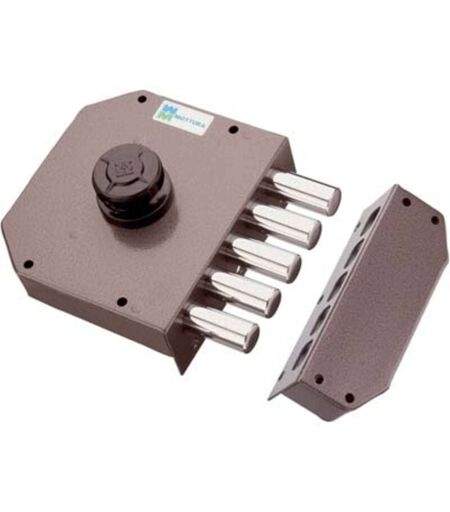Con cilindro a pompa esterno Mm. 60x34 e pomolo interno. Chiusura con catenaccio a 5 pistoni e 4 mandate, corsa Mm. 40. Scatola Mm. 132x146. In acciaio verniciato. In dotazione: 3 chiavi, 1 mostrina, 1 ferrogliera e viti per il montaggio. ...