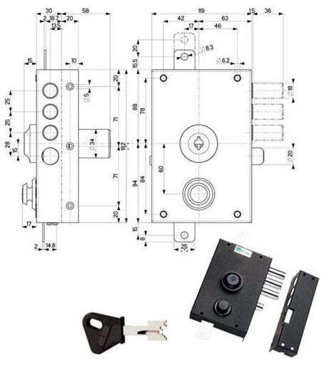 Serratura pompa applicare legno 2 chiusure verticali - Pomolo interno Catenacci laterali 3 pistoni e scrocco Misura scatola mm 119x182x30 - Entrata mm 63 Diametro cilindro mm 34 - Aste non incluse Ferrogliera elettrica con riscontro regolabile 3 chiavi ...