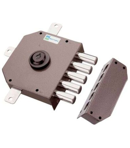 Con cilindro a pompa esterno Mm. 60x30 e calotta chiave interna. Chiusura quintupla con catenaccio a 5 pistoni e 4 mandate, corsa Mm. 40, predisposizione per fissaggio aste, corsa Mm. 17, e deviatore. Scatola Mm. 132x146. In acciaio verniciato. In dotazione: 3 chiavi, 1 mostrina, 1 ferrogliera, 2 passanti aste, 1 cavallotto, 1 bocchetta a pavimento e viti per il montaggio. ...