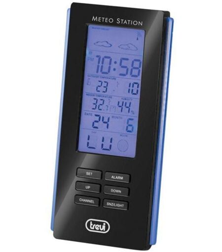 Stazione Meteo Trevi ME 3108 con Orologio radiocontrollato 12/24h, sveglia con suoneria programmabile e calendario con data e giorno della settimana multilingue. Pratico display retroilluminato a Led di colore blu con indicazioni delle previsioni meteo, temperatura e umidità. Comodo sensore esterno senza fili per la rilevazione della temperatura. ...