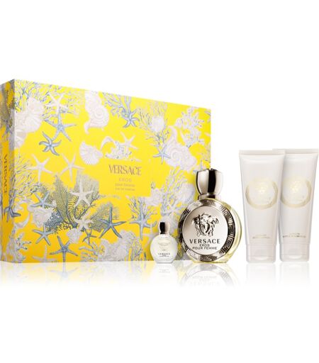 Versace Eros Pour Femme, , Set da donna per donna, Non c’è più bisogno che ti separi a lungo dal tuo profumo. Il kit di profumi da donna Versace Eros Pour Femme contiene la versione intera del profumo e un suo campioncino che troverà facilmente posto anche nella borsetta più piccola per essere sempre pronta ad avvolgerti di nuovo nel tuo aroma inconfondibile in qualsiasi momento della giornata. Caratteristiche: il kit colpisce a prima vista per la sua splendida confezione eccellente come regalo Il set contiene: Versace Eros Pour Femme Eau de Parfum 100 ml gel doccia profumato 100 ml latte corpo profumato 100 ml Eau de Parfum 5 ml ...