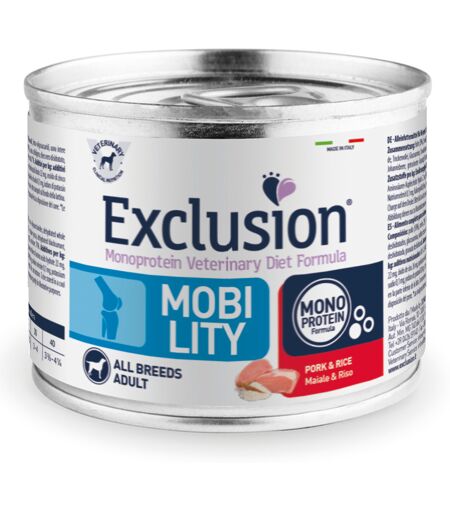 Alimento completo dietetico con formulazione monoproteica animale per favorire la mobilità articolare Exclusion Monoprotein Veterinary Diet Formula Mobility è un alimento dietetico con formulazione monoproteica, realizzato con un’unica fonte alternativa di proteine animali, ingredienti innovativi e preservato con tocoferoli naturali; rappresenta la risposta nutrizionale a disposizione del Veterinario, differenziata per taglia, come supporto nutrizionale per favorire la mobilità articolare. INGREDIENTI: maiale (90%), riso (4%), olio di salmone, ß-1,3/1,6 glucani da parete cellulare di lievito Saccaromyces cerevisiae (0,02%), glucosamina, solfato di condroitina ...
