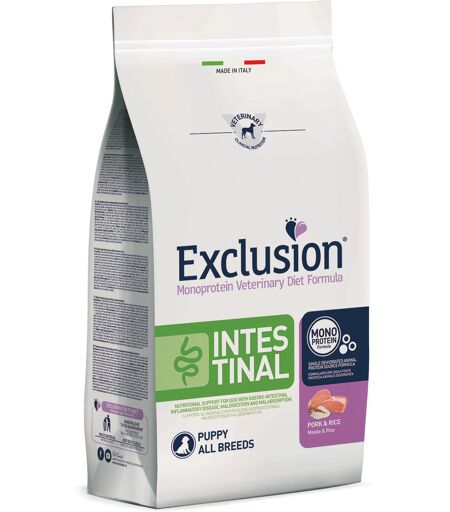Exclusion Monoprotein Veterinary Diet Formula INTESTINAL PORK & RICE Descrizione Alimento completo dietetico per cuccioli formulato per la riduzione dei disturbi acuti dell'assorbimento intestinale e compensazione della cattiva digestione. Possiede un accresciuto livello di elettroliti, ingredienti ad elevata digeribilità e bassa concentrazione di grassi. Componenti Riso (36%), maiale disidratato (30%), grasso di maiale, polpa di cicoria essiccata, erba medica disidratata, fosfato monocalcico, lievito di birra (3,5%), cloruro di potassio, cloruro di sodio, fibra di piselli, semi di lino, mannano-oligosaccaridi (0,4%), frutto-oligosaccaridi (0,25%), tegumento e semi di psyllium, beta-1,3/1,6-glucani da parete cellulare di lievito Saccaromyces cerevisiae (0,08%). Additivi nutrizionali per kg Vitamina A 18.750 U.I., vitamina D3 1.125 U.I., vitamina E 375 mg, vitamina C 62 mg, vitamina B1 17 mg, vitamina B2 21 mg, niacinamide 67 mg, vitamina B5 85 mg, vitamina B6 12 mg, vitamina B12 0,18 mg, vitamina H 1,5 mg, betacarotene 6 mg, cloridrato di betaina 1.750 mg, acido folico 3 mg, ossido di zinco (zinco 160 mg), carbonato di ferro (II) (ferro 122 mg), ossido di manganese (II) (manganese 70 mg), solfato di rame (II) pentaidrato (rame 25 mg), ioduro di potassio (iodio 3,8 mg), selenito di sodio (selenio 0,5 mg). Antiossidanti: estratti di tocoferoli da oli vegetali 70 mg. Componenti analitici Proteina grezza 28%; grassi grezzi 20%; ceneri grezze 6%; fibra grezza 2,1%; umidità 8%; calcio 1,2%; potassio 0,85%; fosforo 1%; sodio 0,45%. Conservazione Conservare in luogo fresco e asciutto. Formato 800 g Cod. INPA08 ...
