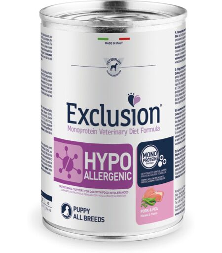 Exclusion Hypoallergenic Puppy All Breeds Pork & Pea Descrizione Exclusion Diet Hypoallergenic Pork and Pea Puppy All Breeds è un alimento completo dietetico per cuccioli formulato per la riduzione di intolleranze a ingredienti e a sostanze nutritive. Possiede infatti fonti selezionate di proteine e carboidrati. Indicato per cuccioli con intolleranze alimentare. Ingredienti Maiale (90%), piselli (4%), olio di girasole, fruttoligosaccaridi, aloe vera, glucosamina, solfato di condroitina, proteina grezza (8,5%), grassi grezzi (7%), ceneri grezze (2%), fibra grezza (0,5%), umidità (80%). Caratteristiche nutrizionali Additivi Per kg Vit. A 3.300 U.I. Vit. D3 210 U.I. Vit. E 15 mg Vit. C 48 mg Vit. B1 2,4 mg Vit. B2 2,8 mg Vit. B3 9,5 mg Vit. B6 1,2 mg Vit. B12 0,01 mg Betaina 240 mg Ac. folico 0,12 mg Solfato rameico pentaidrato (rame 1,9 mg) Taurina 60 mg Modalità d'uso Si raccomanda di chiedere il parere di un veterinario prima dell'uso. Somministrare i quantitativi indicati riportati in tabella, in base al peso del gatto, come unica fonte di cibo. Periodo d'impiego raccomandato: 3-8 settimane; se i sintomi di intolleranza scompaiono il prodotto può essere usato fino a fine accrescimento. Conservazione Conservare in luogo secco e asciutto. Formato Lattina da 200 g e da 400 g. Cod. PA20 per il formato 200 g PA37 per il formato 400 g ...