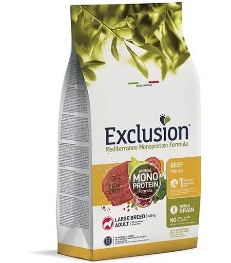 Exclusion Mediterraneo Monoprotein Noble Grain Adult Large Breed con Manzo Alimento completo formulato con una fonte proteica animale per cani adulti di grande taglia. Composizione: manzo disidratato (26% ), riso, piselli, grasso di maiale, proteine animali idrolizzate a basso peso molecolare, erba medica disidratata, canapa (1% ), lieviti, fosfato monocalcico, carbonato di calcio, polpa di cicoria essiccata (0,5% ), cloruro di sodio, olio di camelina (0,3% ), olio di oliva (0,3% ), β-1,3 glucani da alga Euglena gracilis (0,06% ), glucosamina (0,04% ), broccolo disidratato (0,03% ), melagrana disidratata (0,03% ), pomodoro disidratato (0,03% ), yucca schidigera, solfato di condroitina (0,01% ). Componenti analitici: proteina grezza 26% , grassi grezzi 16% , ceneri grezze 5% , fibre grezze 2,3% , cloruri 8% , calcio 1,1% , fosforo 0,9% . Additivi per kg: additivi nutrizionali: Vit. A 10.850 U.I., Vit. D3 540 U.I., Vit. E 500 mg, Vit. C 55 mg, Vit. B1 9 mg, Vit. B2 5 mg, Vit. B3 ...