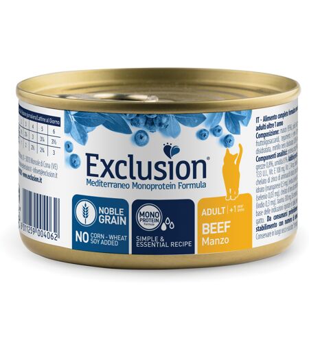 EXCLUSION MEDITERRANEO NOBLE GRAIN CAT ADULT BEEF ALL BREEDS Descrizione Alimento completo formulato con una fonte proteica animale, per gatti adulti oltre 1 anno. Alimento completo e bilanciato, formulato con una sola fonte proteica animale disidratata, per una ricetta chiara ed essenziale, e con solo un cereale nobile di alta qualità. La specifica formulazione aiuta il buon funzionamento delle vie urinarie ed è preservato con antiossidanti naturali. È realizzato con una innovativa ricetta con superfood della tradizione mediterranea: melagrana, more, lamponi e mirtilli neri. È arricchito con Psyllium per aiutare a contrastare la formazione dei boli di pelo. Senza grasso di pollo, frumento, soia e mais aggiunti. Ingredienti Manzo (95%), piselli, riso, polpa di cicoria essiccata, olio di salmone, fruttoligosaccaridi, tegumento e semi di psyllium, mannanoligosaccaridi, melagrana disidratata, mirtillo nero disidratato (0,03%), mora disidratata, lampone rosso disidratato. Caratteristiche nutrizionali Valori medi prodotto Vit. A 3.370 U.I. Vit. D3 133 U.I. Vit. E 108 mg Vit. C 34 mg Rame 0,5 mg Zinco 6,5 mg Manganese 0,5 mg Selenio 0,03 mg Ferro 3,5 mg Iodio 0,3 mg Taurina 300 mg DL-metionina 33 mg Modalità d’uso Servire sulla base delle indicazioni riportate in tabella, tenendo sempre acqua fresca a disposizione del gatto. Conservazione Conservare in frigorifero. Validità a confezionamento integro: 24 mesi. Formato 85 g. Cod. NGCABW85 ...