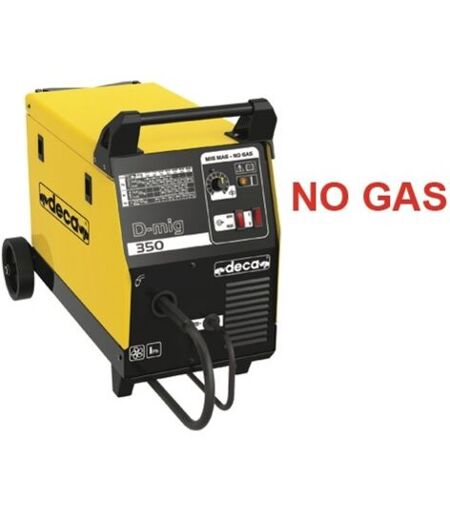 SALDATRICE DECA D-MIG 350 CD. 254400 PER SALDATRICE A FILO CONTINUOPer saldatura a filo continuo con sistema "No Gas" che non necessita di gas di protezione, effettua saldature ad alta resistenza, per saldature esterne anche in presenza di vento. Monofase 230 Volt, tensione a vuoto 31-49 Volt, potenza nominale max 1,7 kw, campo di regolazione 35-145 Amp., 4 posizioni di saldatura, fili utilizzabili à mm. 0,9In dotazione: torcia mt. 2, filo animato 0,9 mm., filo acciaio 0,6 mm., cavo con morsetto di massa, adattatore bombole ...