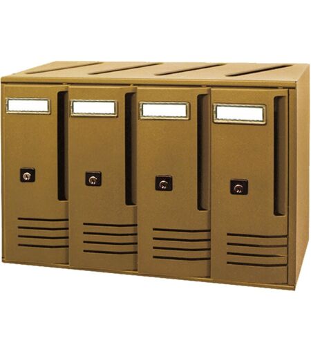 CASSETTA POSTALE CASELLARIO COMPONIBILI 4 POSTI Interamente in alluminio color bronzo, componibile, a quattro cassette formato riviste con introduzione della corrispondenza sia anteriormente che da feritoia superiore, con serratura a cilindro con due chiavi. Dimensioni cm.: L42xP17,5xH30 ...