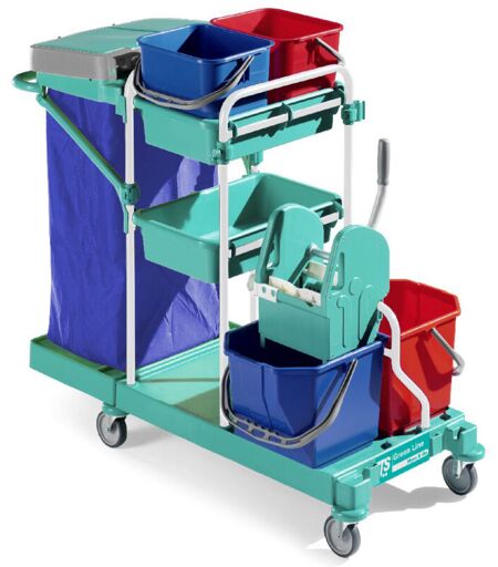 Carrello multiuso modulare e inossidabile , consigliabile per la pulizia degli ambienti medio-grandi . Base in polipropilene, montanti in Rilsan®, portasacco in plastica da 120 Lt. pieghevole, strizzatore Tec, ruote Ø 100 mm, due secchi da 15 Lt. blu/rosso, 2 secchi 12 Lt. rosso/blu , attacco portamanico, portastrizzatore in Rilsan, 2 vaschette piccole cm 27x44. La base in plastica permette l'appoggio ed il trasporto di attrezzature varie ed evita sgocciolamenti sul pavimento in fase di pulizia. Sacco e coperchio non in dotazione. Conforme ai CAM Pulizia generale e Pulizia e sanificazione nelle strutture sanitarie (DM 29/01/2021): indicato per la rimozione di sporco bagnato, grasso o incrostato in ambienti in cui è previsto il risciacquo, consente di separare la soluzione detergente dall‘acqua di risciacquo ed è dotato di secchi con codice colore realizzati in plastica riciclata al 50% COMPONENTI INCLUSI - Base piccola con ruote Ø 100 mm, targhe blu - Portasacco in plastica 120 Lt. ...