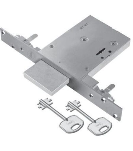 Serrature Corni DM Trak N9101460 Serratura a 4 mandate a doppia mappa per inferriate e cancelletti di sicurezza. Serratura, frontale e catenaccio in acciaio zincato. Solo catenaccio 4 mandate, ambidestra, 3 punti di chiusura, attacchi M8 premontati per aste filettate, frontale 25x3 mm., altezza scatola serratura 82 mm. Entrata 60 mm. ...
