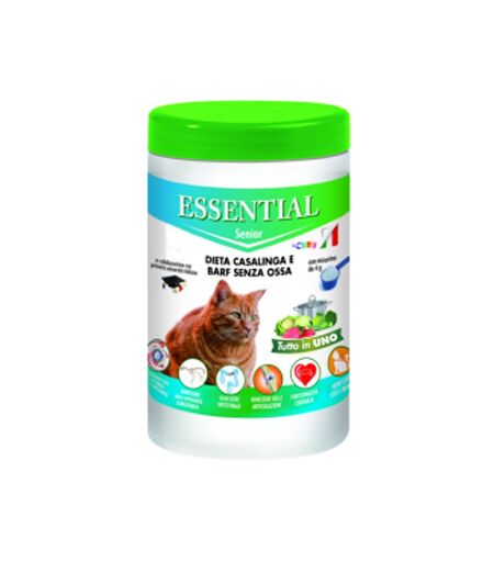 ESSENTIAL Gatto Senior - Descrizione Integratore completo, essenziale per l'integrazione della dieta casalinga, a eliminazione, o BARF senza ossa del gatto anziano. La presenza dei macroelementi minerali (calcio, fosforo, magnesio, cloro, sodio e potassio), degli oligoelementi minerali (zinco, ferr… ...