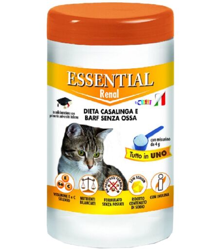 ESSENTIAL ADULT RENAL GATTI - Descrizione Essential Gatto Renal è l'alimento complementare, essenziale per l'integrazione della dieta casalinga, a eliminazione, o BARF senza ossa del gatto adulto, ideale per favorirne la corretta funzionalità renale. La vitamina E, la vitamina C e il selenio contra… ...