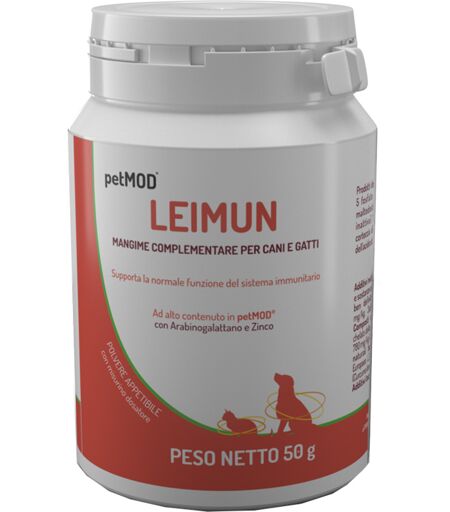 petMOD - LEIMUN - Descrizione Mangime complementare in polvere appetibile per cani e gatti. Formulato ad alto contenuto in petMOD, con arabinogalattano e zinco per supportare la normale funzione del sistema immunitario animale. Componenti Prodotti del lievito (petMOD - nucleotidi 5 fosfato da lievi… ...