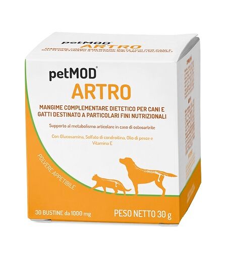 petMOD - ARTRO - Descrizione Mangime complementare dietetico per cani e gatti destinato a particolari fini nutrizionali come supporto al metabolismo articolare in caso di osteoartrite. Formulato in polvere appetibile con acidi grassi omega - 3 da olio di pesce, glucosamina, solfato di condroitina, … ...