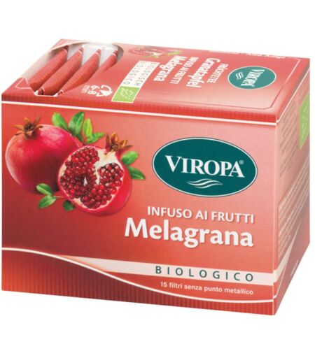 VIROPA Melagrana - Infuso di melograno. La pianta melograno (Punica granatum) è un arbusto cespuglioso, il frutto, la melagrana, è una bacca a scompartimenti in due piani (balausta) sormontata dal calice. L'infuso alla frutta melagrana ha un sapore leggermente amaro - acidulo dalla melagrana ed è u… ...