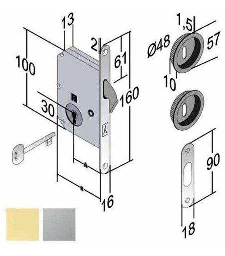 Serratura infilare porte scorrevoli Catenaccio a gancio Foro chiave patent Frontale bordo tondo mm 16x160 Incontro mm 18x90 Scatola mm 70x100 spessore 13 - Entrata mm 50 Coppia maniglie tonde mm 48 incasso 1 chiave ...