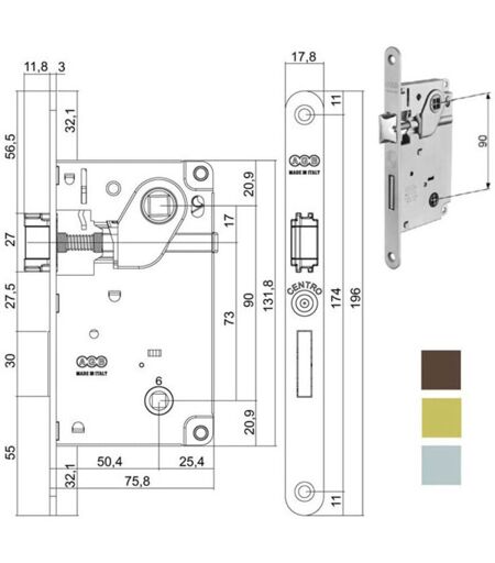 Serratura infilare legno interasse mm 90 Frontalebordo tondo ferro verniciato mm 22x196 catenaccio Scrocco reversibile quadro mm 8 Quadro bagno mm6 Altezza scatola 132 Incontro non incluso ...