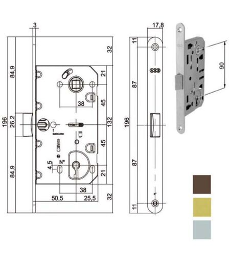 Serratura infilare legno interasse mm 90 Frontalebordo tondo ferro verniciato mm 18x196 Scrocco reversibile quadro mm 8 Scrocco poliammide autolubrificante e silenzioso 1 chiave Altezza scatola 132 Incontro non incluso ...