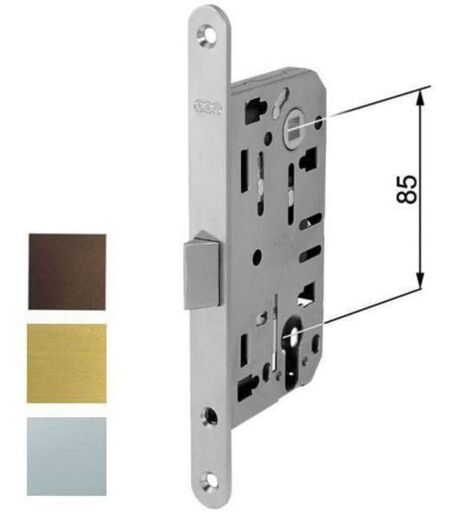 Serratura infilare legno interasse mm 85 Frontalebordo tondo ferro verniciato mm 18x196 Scrocco reversibile quadro mm 8 Scrocco poliammide autolubrificante e silenzioso Foro cilindro Altezza scatola132 Incontro e cilindro non inclusi ...