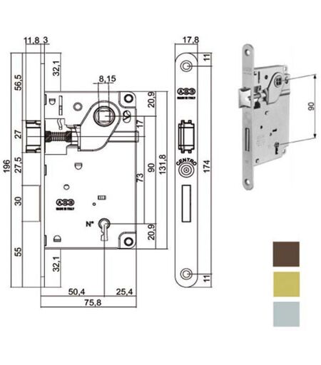 Serratura infilare legno interasse mm 90 Frontalebordo tondo ferro verniciato mm 18x196 catenaccio Scrocco reversibile quadro mm 8 1 chiave Altezza scatola 132 Incontro non incluso ...