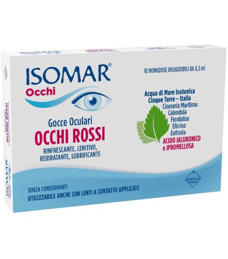 ISOMAR OCCHI ROSSI - Descrizione Gocce oculari per occhi rossi. Dona sollievo in caso di arrossamento, irritazione, bruciore, prurito e sensazione dicorpi estranei e in seguito a lacrimazione ed affaticamento indotti da fattori quali:esposizione al vento e a raggi solari, polveri, smog, fumo, caldo… ...