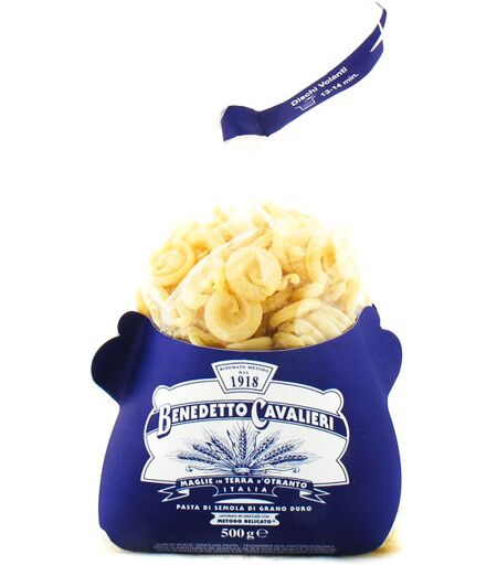La Pasta Benedetto Cavalieri di semola di grano duro proviene da un'agricoltura attenta e che non utilizza fertilizzanti. Il grano viene poi lavorato secondo il ''Metodo Delicato'' che deriva da una prolungata impastatura e gramolatura per poi esser pressata e trafilata al bronzo ed essiccata a bassa temperatura. 500 grammi ...