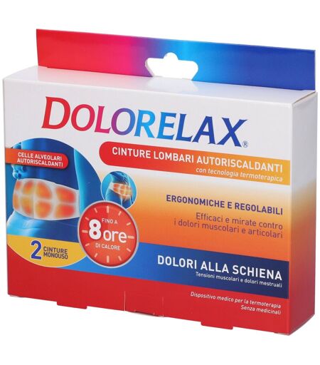 Dolorelax Cintura Lombare Autoriscaldante Senza medicinali. Cintura lombare autoriscaldante, studiata per adattarsi perfettamente all'area lombare e addominale del paziente. Efficace e mirata contro i dolori muscolari e rigidità della schiena, efficace nelle lombalgie e contro i dolori mestruali. Adatta sia per i dolori cronici che per quelli occasionali. Fornisce 8 ore di trattamento termoterapico ad una temperatura di circa 40 °C. Avvertenze: Monouso: non riutilizzare. Formato: 2 pezzi ...