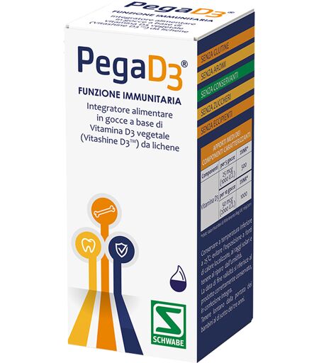 PegaD3 Gocce 20 mlIntegratore di Vitamina D Descrizione Integratore alimentare in gocce a base di vitamina D3 vegetale (Vitashine D3) da lichene. -Contribuire alla normale funzione immunitaria -Contribuire al mantenimento della ...
