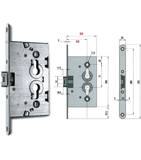Per doppio cilindro sagomato. Scrocco reversibile con catenaccio incorporato. Chiusura a 1 mandata. Quadro maniglia Mm. 9. Frontale in acciaio zincat... Per doppio cilindro sagomato. Scrocco reversibile con catenaccio incorporato. Chiusura a 1 mandata. Quadro maniglia Mm. 9. Frontale in acciaio zincato con bordo tondo da Mm. 20x235. Altezza scatola Mm. 160. ...