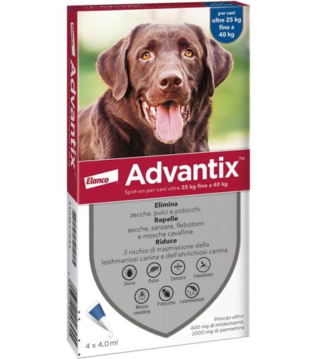 Antiparassitario attivo contro pulci, zecche, pappataci, pidocchi e mosca cavallina. Agisce contro zecche zanzare e pappataci prima che possano pungere.brRiduce il rischio di trasmissione di malattie come la Leishmaniosi e altre malattie trasmesse da vettore grazie alleffetto repellente. Oltre 25 kg fino a 40 kg. Confezione con 6 pipette da 4,0 ml. cad. ...